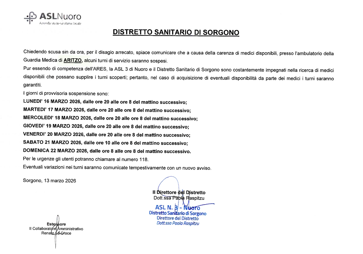 Il Direttore del Distretto Sanitario di Sorgono porta a conoscenza della sospensione del Servizio di Guardia Medica in Aritzo nei seguenti giorni: