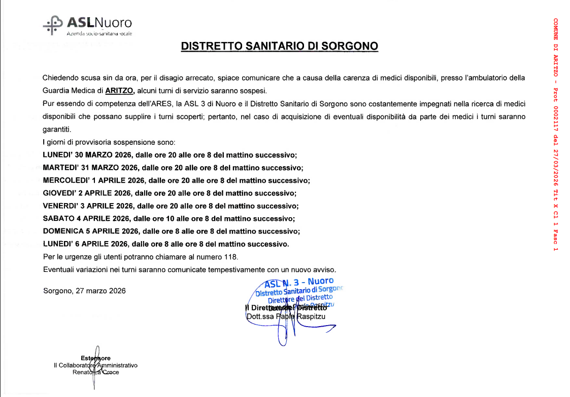 Il Direttore del Distretto Sanitario di Sorgono porta a conoscenza della sospensione del Servizio di Guardia Medica in Aritzo nei seguenti giorni: